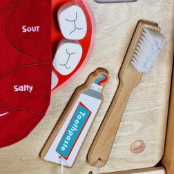 To interaktywne narzędzie edukacyjne rozwija małą motorykę, myślenie logiczne oraz świadomość zdrowotną dzieci. Duży ruchomy język z oznaczonymi strefami smaków i zestaw produktów na rzep zamieniają naukę w świetną zabawę. W zestawie znajdują się realistyczne dodatki – szczoteczka do zębów, pasta i nić dentystyczna.