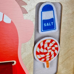 Duży ruchomy język z wyraźnie oznaczonymi strefami smaków oraz produkty na rzep uczą dzieci rozróżniać smak słodki, słony, kwaśny i gorzki.