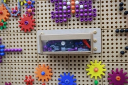Zawartość pojemnika widać na pierwszy rzut oka – dzieci łatwo znajdą właściwe kołki lub śrubki, a praca na tablicy STEM jest płynna i przyjemna.