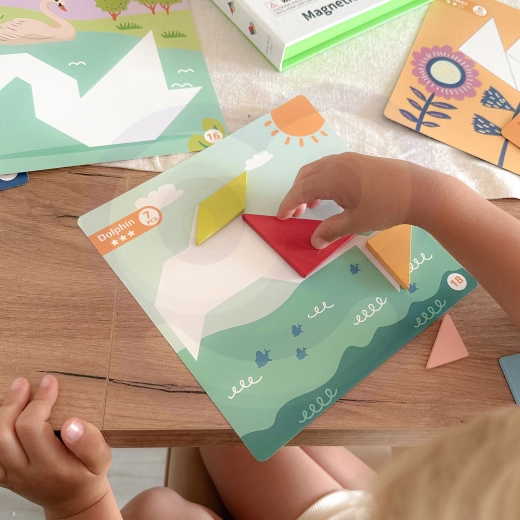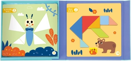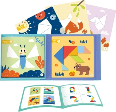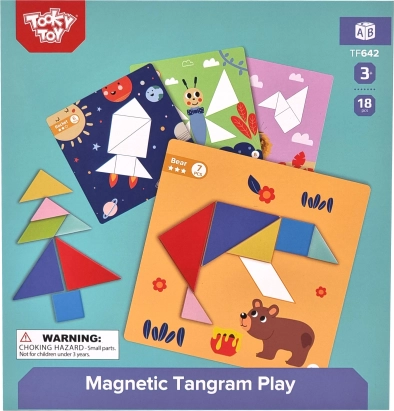 Z magnetycznym tangramem TOOKY TOY dzieci łatwo układają kształty i obrazki na przygotowanych podkładach. Kolorowe geometryczne elementy przylegają do podkładki, więc wygodnie się nimi manipuluje w domu i w podróży. Zabawa wspiera wyobraźnię, koncentrację oraz samodzielne rozwiązywanie zadań.