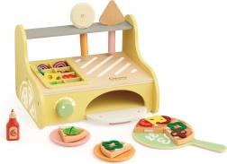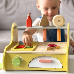 Mały drewniany piekarnik z drzwiczkami i obrotowym pokrętłem wciąga dzieci do zabawy w gotowanie. Idealny do pierwszego „pieczenia” i serwowania pizzy.