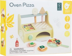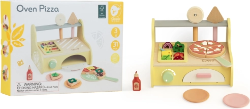 Drewniany piec do pizzy CLASSIC WORLD to kreatywna zabawka dla dzieci od 3 lat, rozwijająca małą motorykę i wyobraźnię. W zestawie znajduje się „piekarnik”, pizza z zdejmowanymi filcowymi składnikami, obrotowe pokrętło, talerzyki oraz akcesoria do serwowania. Bawiąc się w kucharza, dzieci ćwiczą odgrywanie ról, koordynację ręka–oko i odkrywają radość z twórczego przygotowywania pizzy.