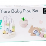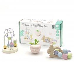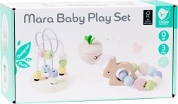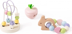 Pastelowy zestaw motywacyjnych zabawek dla niemowląt marki Classic World został zaprojektowany tak, aby przynosić radość i stymulować zmysły Twojego dziecka już od pierwszych dni. Ten drewniany komplet zawiera kilka pięknych elementów, które pomagają rozwijać motorykę oraz koncentrację. Szczęśliwy króliczek to grzechotka z koralikami, która zachwyca kolorystyką i melodyjnymi dźwiękami. Potrząsanie zabawką pobudza ciekawość i wspiera rozwój słuchu. Labirynt z koralikami to kolejny element zestawu, w którym dzieci mogą obracać i przesuwać koraliki, rozwijając koncentrację i sprawność manualną. Zabawki mają delikatną fakturę i pastelowe barwy, co jest przyjemne zarówno dla dzieci, jak i rodziców.