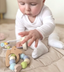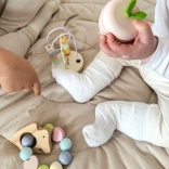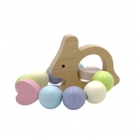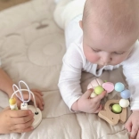 Kolorowy króliczek wypełniony koralikami przyciąga uwagę dzieci i rozwija ich słuch. Idealny do ćwiczenia umiejętności chwytania.