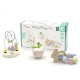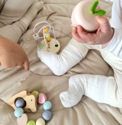 Zabawki w tym zestawie mają delikatną fakturę i stonowane kolory, co sprawia, że zabawa jest przyjemna i edukacyjna.