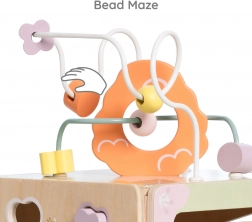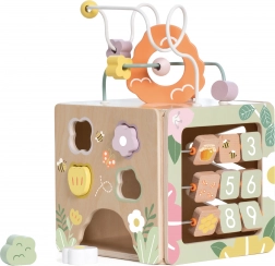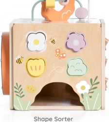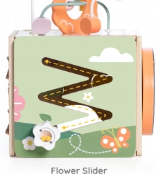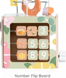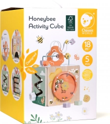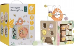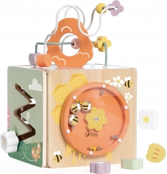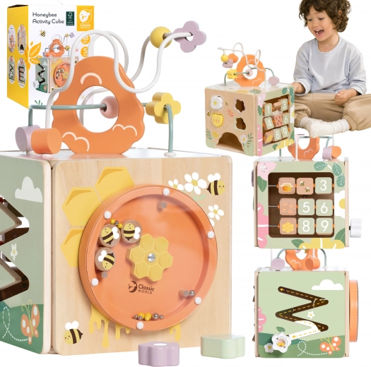 Odkryj magię drewnianej kostki, która oferuje pięć różnych aktywności w jednej. Dzieci znajdą tu obrotowe kostki z cyframi i obrazkami, labirynt kulkowy, przesuwne listwy, kształty geometryczne i obrotowe kółko z pszczołami. Każdy element kostki zaprojektowany jest tak, aby stymulować ciekawość i rozwijać umiejętności dzieci.