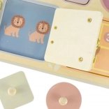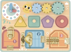 Drewniana tablica manipulacyjna od Tooky Toy oferuje kreatywne i edukacyjne doświadczenie. Wyposażona jest w trzy różne zamki z ukrytymi obrazkami zwierząt, które stymulują wyobraźnię dzieci.