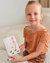 Zestaw został zaprojektowany tak, aby dziecko mogło wielokrotnie trenować liczenie dzięki dołączonemu zmazywalnemu markerowi. Karty są podzielone na te z odejmowaniem i dodawaniem. Dla ułatwienia nauki karty zawierają dwa poziomy – można zacząć od strony, na której zadania matematyczne uzupełniają obrazki, które mogą pomóc dziecku przy obliczaniu wyniku. Druga strona kart oferuje obliczenia bez pomocy obrazków. Dzięki temu modelowi nauki Twoje dziecko nie odczuje presji trudności nowego materiału, a rozwiązywanie zadań matematycznych będzie czystą przyjemnością! Aby zmotywować dziecko do nauki, po każdym poprawnie rozwiązanym zadaniu można narysować w rogu karty serduszko.