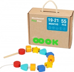 Zestaw do nawlekania zawierający 11 klocków o różnych kształtach i jeden sznurek. Wspiera małą motorykę i koordynację ręka-oko.