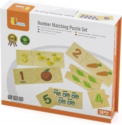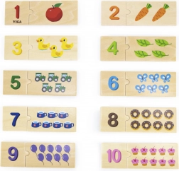 Ten wspaniały drewniany zestaw puzzli od VIGA koncentruje się na ćwiczeniu liczenia i rozpoznawania liczb. Dzięki puzzlom dziecko łatwo uczy się liczyć, rozpoznawać liczby i dopasowywać odpowiednią liczbę obiektów do każdej cyfry. Dzięki atrakcyjnym kolorom i obrazkom, takim jak zwierzęta, owoce czy pojazdy, dzieci poznają otaczający je świat. Zestaw pomaga również rozwijać koncentrację, zasób słownictwa i myślenie logiczne.