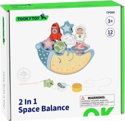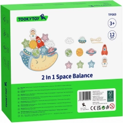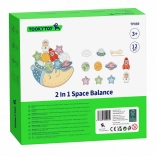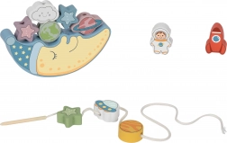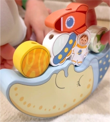Pierwszą częścią zestawu jest wyzwanie równoważenia: dzieci próbują umieścić 10 kolorowych klocków – rakietę, astronautę, gwiazdy, UFO, planety i wesołą chmurkę – na śpiącej twarzy księżyca, starając się, aby konstrukcja nie spadła. To świetna okazja do ćwiczenia precyzji i cierpliwości.