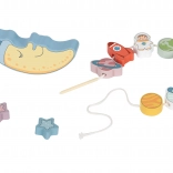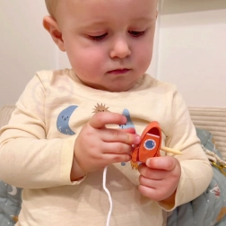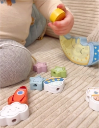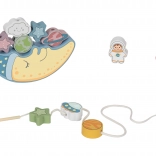 Druga część oferuje kreatywną zabawę w nawlekanie: klocki można nawlekać za pomocą drewnianej igły i sznurka, co pomaga rozwijać małą motorykę oraz koordynację ręka-oko.