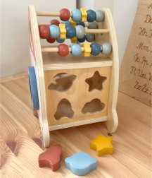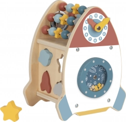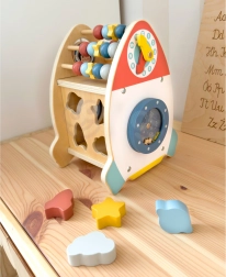 Zabawka pomaga rozwijać małą motorykę dzięki interaktywnym elementom, takim jak koraliki i sortowanie kształtów.
