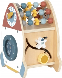 Dzięki różnym aktywnościom, takim jak mały labirynt czy regulowany zegar, zabawka wspiera kreatywne myślenie i koordynację.