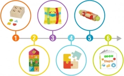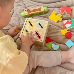 Sześć aktywności edukacyjnych w jednym pudełku rozwija motorykę małą, koordynację ręka–oko, logiczne myślenie oraz rozpoznawanie kształtów i kolorów – z naciskiem na samodzielność dziecka.