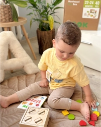 - Sorter kształtów – drewniana kostka z 16 kolorowymi elementami w 4 kształtach do treningu sortowania, koordynacji i rozpoznawania.