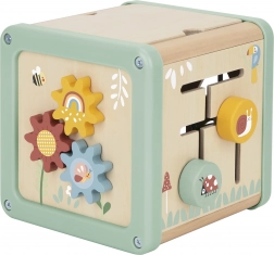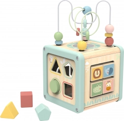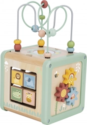 Na górnej stronie znajdziesz motoryczny labirynt z koralikami i bezpieczne lusterko, a na bokach sorter kształtów, obrotowe kostki ze zwierzątkami, zębate kółka i tory przesuwne. Każdy panel zapewnia inny rodzaj wyzwania, dzięki czemu dziecko ćwiczy cierpliwość, kreatywność i rozwiązywanie problemów.