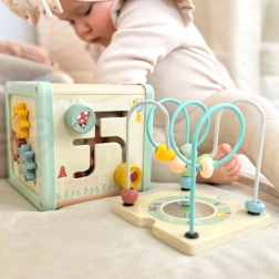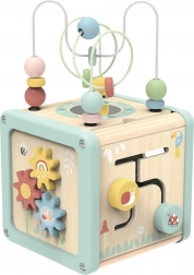 Górna część kostki oferuje kolorowe koraliki do przesuwania po wygiętych drucikach, które rozwijają koordynację i małą motorykę. Lusterko pobudza ciekawość i postrzeganie własnej osoby.