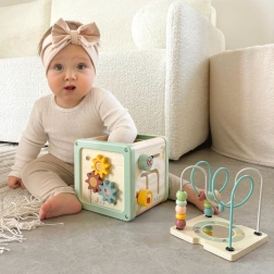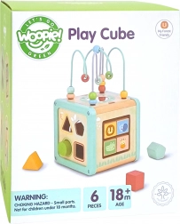 Drewniana aktywna kostka WOOPIE GREEN w delikatnych pastelowych kolorach łączy zabawę i naukę w jednym. Oferuje labirynt z koralikami, sorter kształtów, obrotowe klocki ze zwierzątkami, zębate kółka oraz elementy przesuwne do rozwoju małej motoryki, logiki i koordynacji. Bezpieczne wykonanie z gładkimi krawędziami i wysokiej jakości drewnem to idealny wybór dla dzieci od 18 miesięcy oraz świetny prezent.