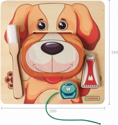 Piesek z otwieraną paszczą i 10 zębami motywuje dzieci do regularnej pielęgnacji zębów. Dzięki szczoteczce, paście i nici dentystycznej bezpiecznie przećwiczą całą rutynę i wyrobią zdrowe nawyki.