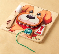 Wprowadź dzieci w zdrowe nawyki w formie zabawy. Tablica z motywem pieska ma otwieraną paszczę i 10 realistycznie odwzorowanych zębów, które mali dentyści mogą czyścić za pomocą dołączonych akcesoriów. Dzięki zabawie w role dzieci w naturalny sposób przyswajają prawidłowe techniki mycia zębów i łatwiej zapamiętują codzienną rutynę. W duchu metody Montessori pomoc wspiera samodzielność, koncentrację i naturalną naukę przez zabawę.