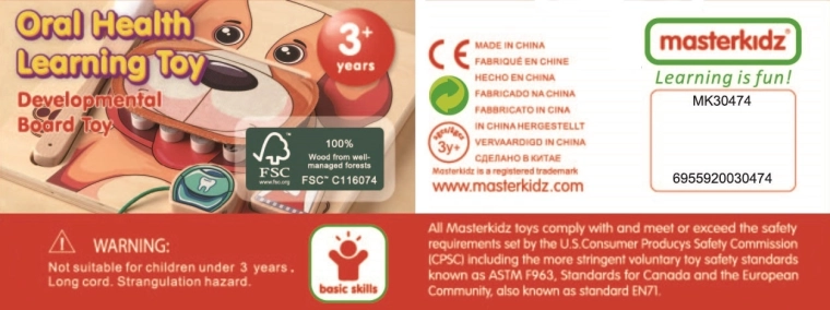 W zestawie znajduje się drewniana szczoteczka, pasta oraz nić dentystyczna, więc dzieci bezpiecznie przećwiczą cały proces – od nałożenia pasty, przez koliste ruchy szczoteczką, aż po delikatne „nitkowanie”. Zabawa jednocześnie rozwija małą motorykę, koordynację ręka–oko i cierpliwość. Wysokiej jakości drewniane wykonanie z wykończeniem na bazie wody jest trwałe i przyjemne w dotyku; kompaktowy wymiar 28 × 28 cm pasuje do pokoju dziecięcego i przedszkola.