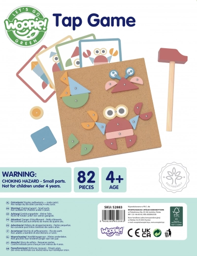 Twórz i ucz się z zestawem drewniana zabawka z gwoździkami WOOPIE GREEN! Kolorowe figury geometryczne mocuje się do korkowej tablicy za pomocą gwoździków i młoteczka według kart lub własnej wyobraźni. Aż 82 elementy, 20 wzorów i 3 poziomy trudności rozwijają motorykę małą, kreatywność, logiczne myślenie oraz koncentrację dzieci od 4 lat.