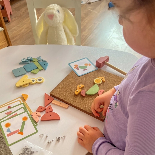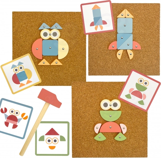 Kompletny zestaw z drewnianymi kształtami, gwoździkami, młoteczkiem i korkową tablicą. Dzieci mogą układać według wzorów lub kierować się własną fantazją.