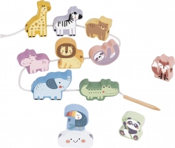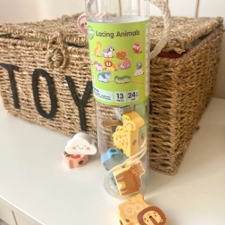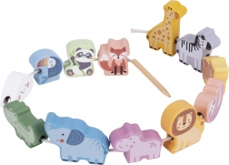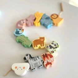 Nawlekanie drewnianych zwierzątek na sznurek naturalnie trenuje chwyt, koordynację ręka–oko i precyzję ruchów – idealne przygotowanie do rysowania i pisania.