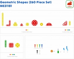 Ten kompleksowy zestaw zawiera kwadraty, trójkąty, koła, półkola oraz płaskie paski w kilku kolorach, które dzięki otworom łatwo przymocować śrubkami do paneli, stołów lub wózków Masterkidz. Dzieci mogą tworzyć wzory, kwiaty i bardziej złożone konstrukcje, trenując planowanie, dobór elementów i dopracowanie detali.