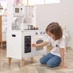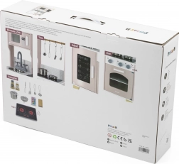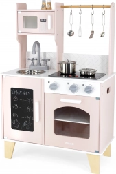 W zestawie bogate akcesoria: garnek z pokrywką, patelnia, łyżka, łyżka cedzakowa, łopatka, zestaw „warzyw” oraz solniczka i pieprzniczka. Funkcjonalne detale, takie jak 3 obrotowe pokrętła, otwierane drzwiczki piekarnika i szafki czy wieszaczki na przybory, dodają realizmu i rozwijają małą motorykę, kreatywność oraz umiejętności społeczne.