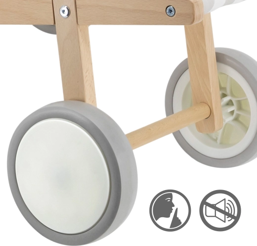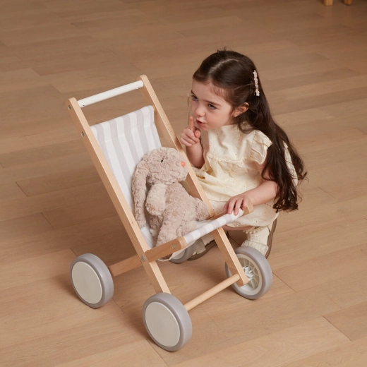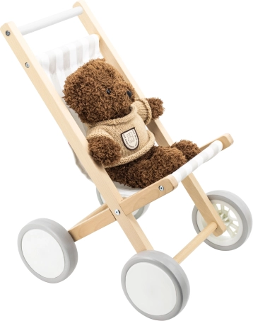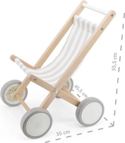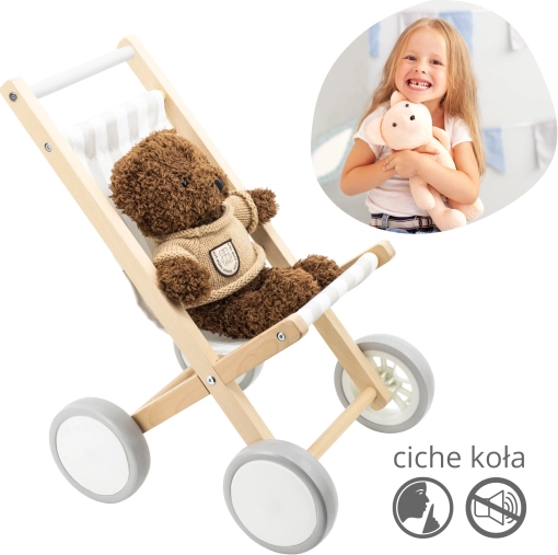 Wózek jest kompatybilny z lalkami i pluszakami do 38 cm, dzięki czemu łatwo stanie się ulubionym dodatkiem do dziecięcego pokoju. Prosty, naturalny wygląd doskonale wpisuje się w nowoczesne i tradycyjne wnętrza.