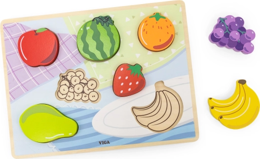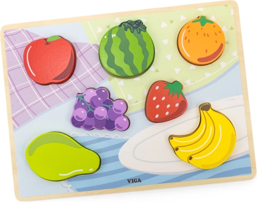 Odkryj naukę przez zabawę z drewnianymi puzzlami z owocami marki Viga. Zestaw zawiera solidną, barwnie ilustrowaną podstawę oraz 7 elementów (jabłko, arbuz, pomarańcza, winogrona, truskawka, banany i gruszka), które dzieci umieszczają w odpowiadających im kształtach. Intensywne kolory i czytelne kontury wspierają rozpoznawanie kształtów i kolorów.