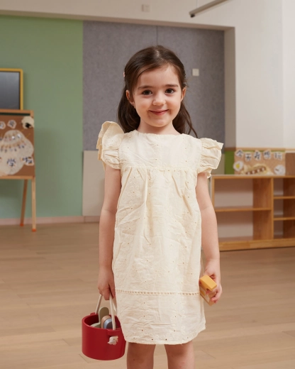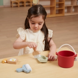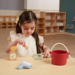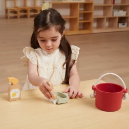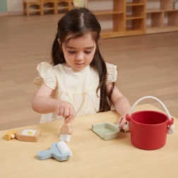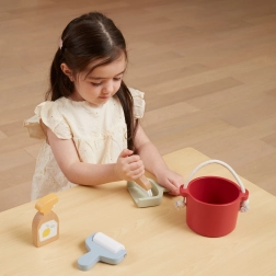 W zestawie znajdziesz wiadro, zmiotkę z szpatułką, drewniany spryskiwacz i wałek – wszystko, czego dziecko potrzebuje do „wielkich porządków”. Wspiera wyobraźnię i zabawy w odgrywanie ról.