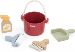 - Kompletne wyposażenie do zabawy w sprzątanie: miotła/zmiotka ze szpatułką, drewniany spryskiwacz, wałek do „zanieczyszczeń” i czerwone wiadro.