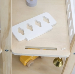 Praktyczny garaż z drewnianym autkiem i innymi akcesoriami poszerza możliwości zabawy i wspiera odgrywanie ról.