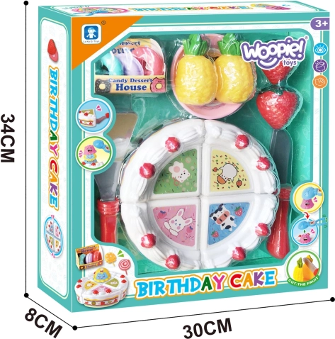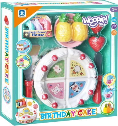 Dziecięcy zestaw Woopie z tortem, owocami i słodkościami do krojenia zapewnia godziny kreatywnej zabawy. Dzieci mogą przygotować urodzinową ucztę, porcować tort do krojenia i serwować przy pomocy akcesoriów. Wspiera rozwój małej motoryki oraz zabawy w odgrywanie ról już od 3 lat.
