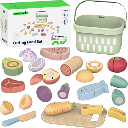 Drewniany zestaw do krojenia żywności od Tooky Toy jest idealny do kreatywnej zabawy w kuchni. Zestaw zawiera 31 elementów, takich jak owoce, warzywa, ryba, jajko, deska do krojenia i nożyk. To kompleksowe wyposażenie umożliwia przygotowywanie pysznych potraw.