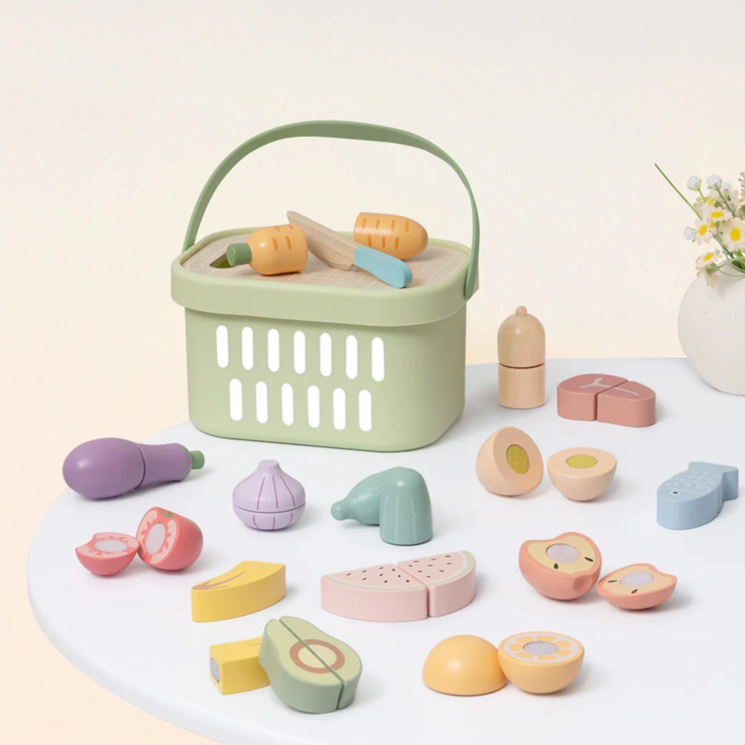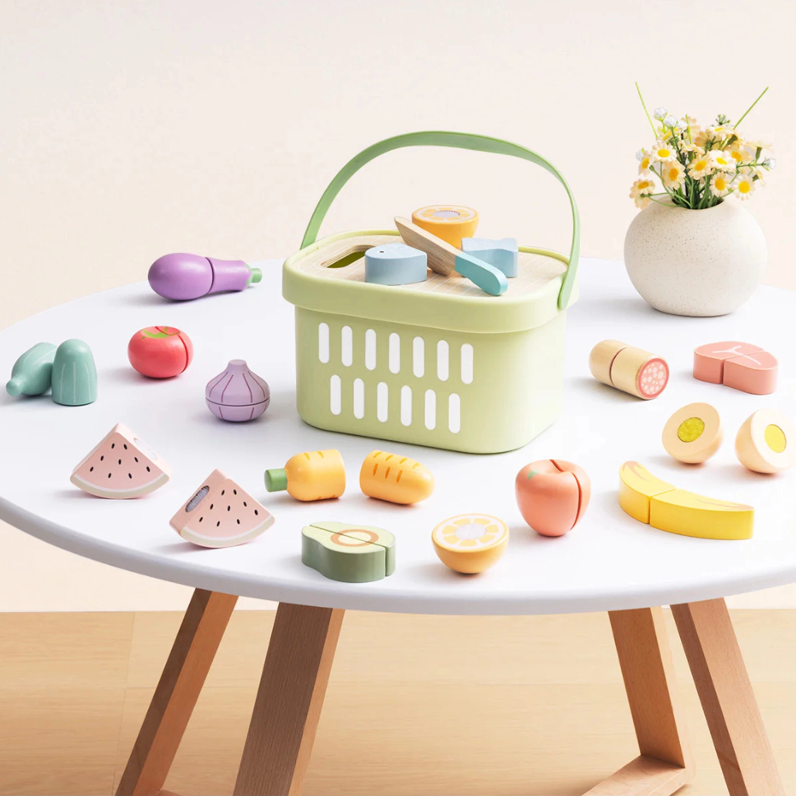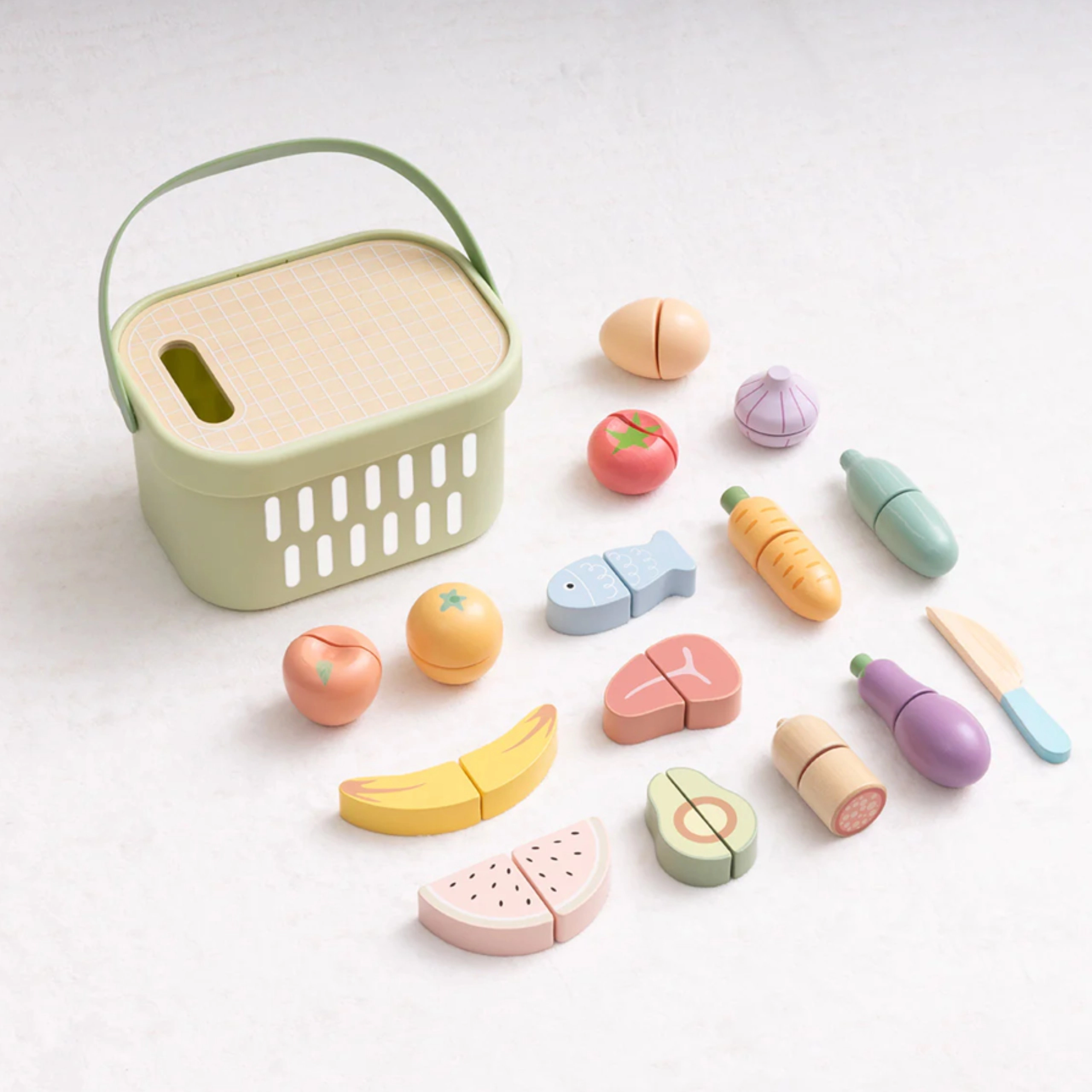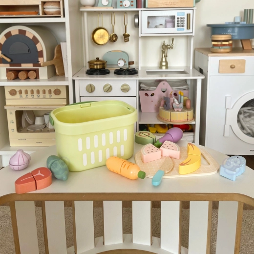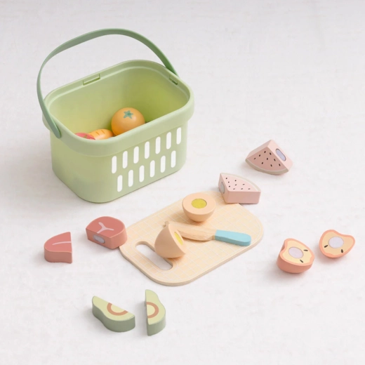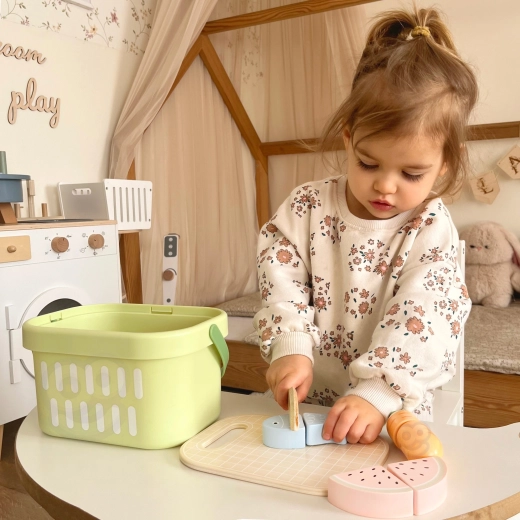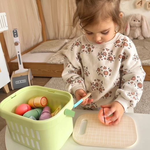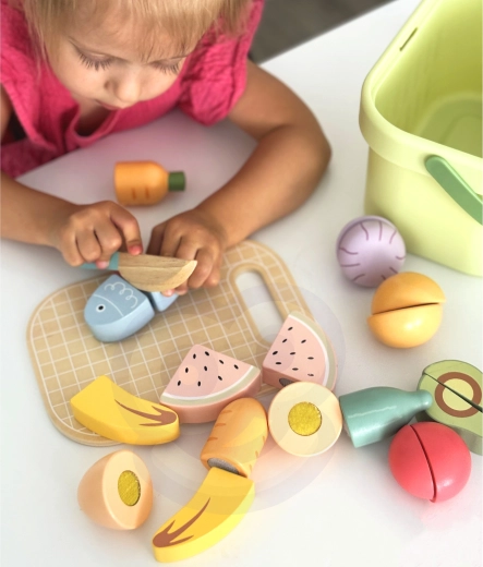 Drewniany zestaw produktów TOOKY TOY jest idealny do dziecięcej kuchni. Pastelowe owoce i warzywa, ryba, stek, ser czy jajko są podzielone na części i połączone rzepem – dzieci mogą je bezpiecznie „kroić” drewnianym nożem na dołączonej desce i ponownie składać. Wszystko mieści się w lekkim koszyku, dzięki czemu zestaw jest łatwy do przenoszenia i zawsze uporządkowany.