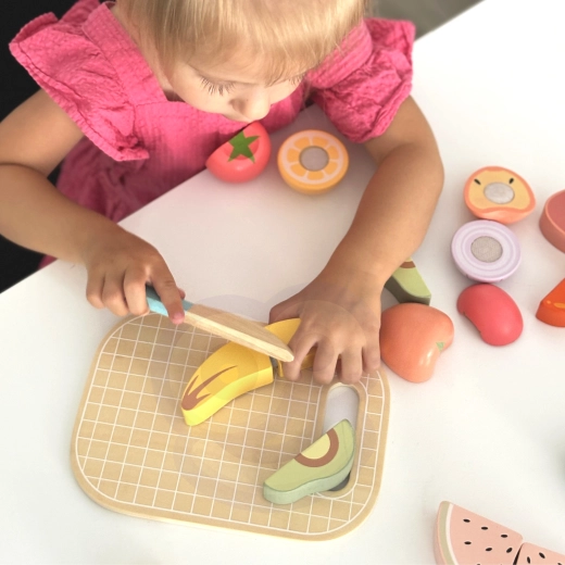 Części owoców i warzyw są segmentowane i połączone rzepem. Dzieci mogą je wielokrotnie „kroić” drewnianym nożem na desce i ponownie składać.