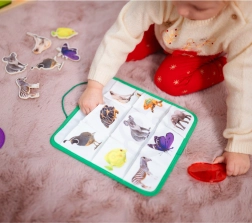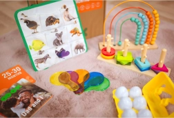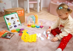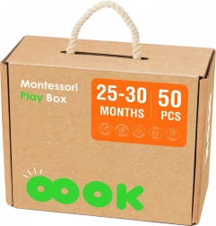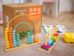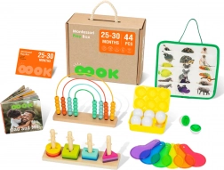 Box edukacyjny zawiera kilka aktywności, takich jak sortowanie kształtów, puzzle ze zwierzętami oraz kolorowe tabliczki optyczne, które rozwijają wyobraźnię wzrokową i sprawność manualną. Kolejne aktywności to na przykład liczydło z tęczą, które uczy podstaw matematyki, oraz montessori tor kulkowy, który doskonali koordynację ręka–oko. Do dyspozycji są także książeczki, pomagające dzieciom zrozumieć relacje między dużym a małym, a także wiele innych kreatywnych ćwiczeń.