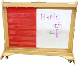 Panel jest lekki, przenośny i dwustronny – tylna strona z rzepem pozwala mocować różne pomoce. Dzięki pętelkom szybko zawiesisz go na ścianie, drzwiach lub stojaku i wykorzystasz w połączeniu z tablicami i stojakami MASTERKIDZ (w tym tablicą STEM).