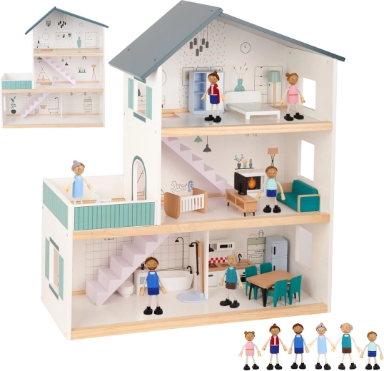 Stylowy drewniany domek dla lalek TOOKY TOY ma trzy poziomy pełne detali, w tym kuchnię, salon, łazienkę i sypialnię z balkonem. W zestawie znajdują się mebelki oraz rodzinka 6 ruchomych figurek, które wspierają kreatywną i społeczną zabawę. Solidna drewniana konstrukcja i bezpieczne wykończenie w delikatnych kolorach są idealne dla dzieci od 3 lat.