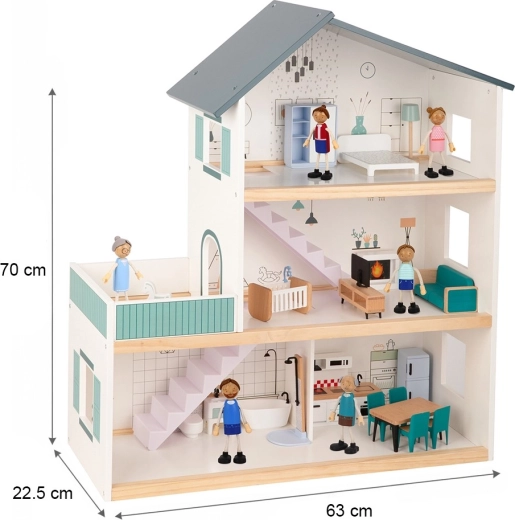 Domek dla lalek z wysokiej jakości drewna oferuje nowoczesny, otwarty design z 3 piętrami dla łatwego dostępu do zabawy. Na parterze znajduje się kuchnia z jadalnią i w pełni wyposażona łazienka, na pierwszym piętrze przytulny salon z kominkiem i TV, a na poddaszu sypialnia z łóżkiem, szafą i dziecięcym kącikiem z kołyską. Nie brakuje też balkonu do scenek na świeżym powietrzu.