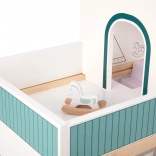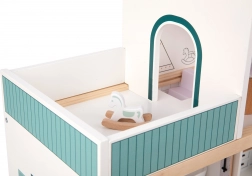 Domek wykonany jest z trwałego drewna z certyfikatem FSC i pomalowany nietoksycznymi farbami w delikatnych pastelowych odcieniach.