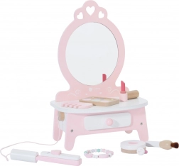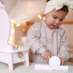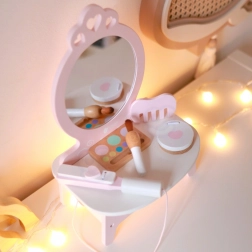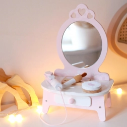 Ta piękna dziecięca toaletka w różowym kolorze jest wyposażona w lustro i 11 różnych akcesoriów, które obejmują grzebień, szminkę, prostownicę do włosów, puderniczkę i inne. Wszystkie dodatki są wykonane z wysokiej jakości drewna, a ich design w pastelowych kolorach dodaje zabawce magicznego wyglądu. Toaletka oferuje dużo miejsca do przechowywania wszystkich tajnych kosmetycznych trików waszej małej modelki.