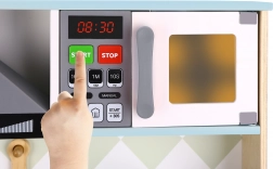 Kuchnia zawiera kuchenkę, piekarnik, mikrofalówkę i inne praktyczne elementy, które symulują prawdziwe gotowanie.
