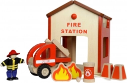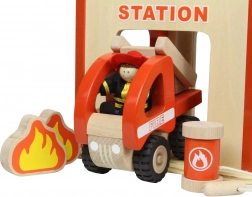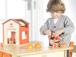 Ta Mini remiza strażacka jest wykonana z drewna, co zapewnia jej trwałość i ekologiczną przyjazność. Zawiera remizę strażacką, dwie figurki strażaków, wóz strażacki oraz różne akcesoria takie jak płomienie, stożki i niebezpieczne beczki. Pozwala dzieciom symulować działania w sytuacjach pożarowych i rozwija ich logiczne myślenie, zdolności społeczne i koncentrację.