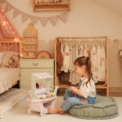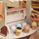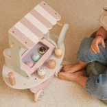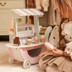 Drewniany wózek do lodów Woopie Green to nie tylko piękny element w delikatnych pastelowych kolorach, ale także pełen możliwości do kreatywnej zabawy. Twoje dziecko może stać się sprzedawcą, klientem lub nawet „mistrzem lodów” i tworzyć własne desery lodowe według własnej fantazji!