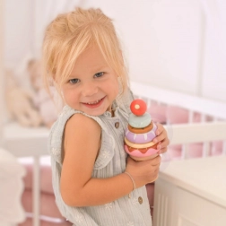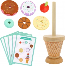 - 12 elementów w zestawie: różne kolorowe pierścienie i drewniany stożek z wisienką na szczycie
